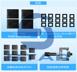 外墻保溫材料試驗(yàn)機(jī)專用附具包含:拉伸用上夾具、伸用下夾具、成型框(外框70*70,內(nèi)框40*40mm,厚度6mm)、拉伸墊板( 外框70*70,內(nèi)框43*43mm,厚度3mm)、40*40*160試塊抗折附具。